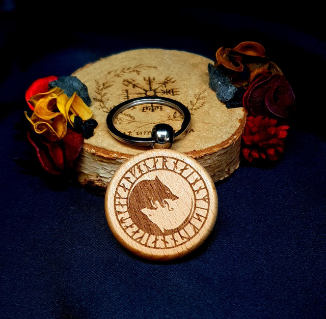 Porte-clés gravé Sköll et Hati, enfants de Fenrir et la géante Larnvidia, ils poursuivent respectivement le soleil et la Lune.