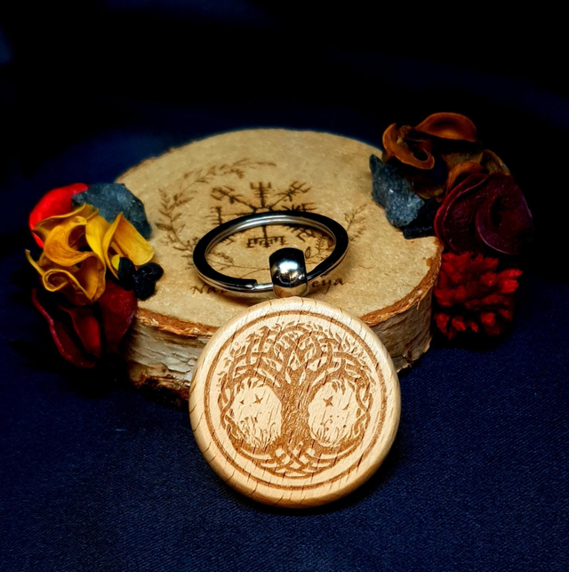 Porte-clés en bois gravé avec une représentation du célèbre arbre mondes : Yggdrasil.